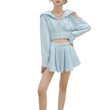 Moda Personalizado Sólido Cortar Colheita Zip up Jaqueta Com Capuz e Mini Saia Plissada Conjunto das Mulheres Sweatsuits Sports Casual Wear