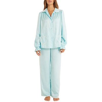 ชุดเสื้อผ้าใส่อยู่บ้านเอวยางยืดสำหรับผู้หญิงชุดชุดนอนแขนยาวแบบติดกระดุมกางเกงขากางเกงทรงลำลองแบบถักโลโก้ออกแบบได้ตามต้องการ
