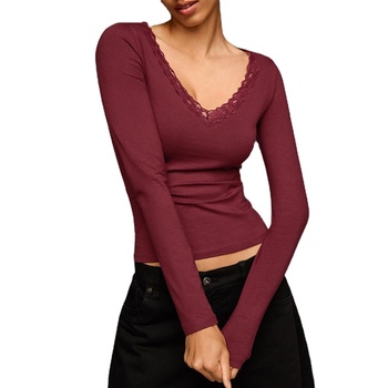 เสื้อยืดลูกไม้คอวีสำหรับผู้หญิงเสื้อยืดแขนสั้นตัดตามสั่งสำหรับสวมใส่ในฤดูร้อน